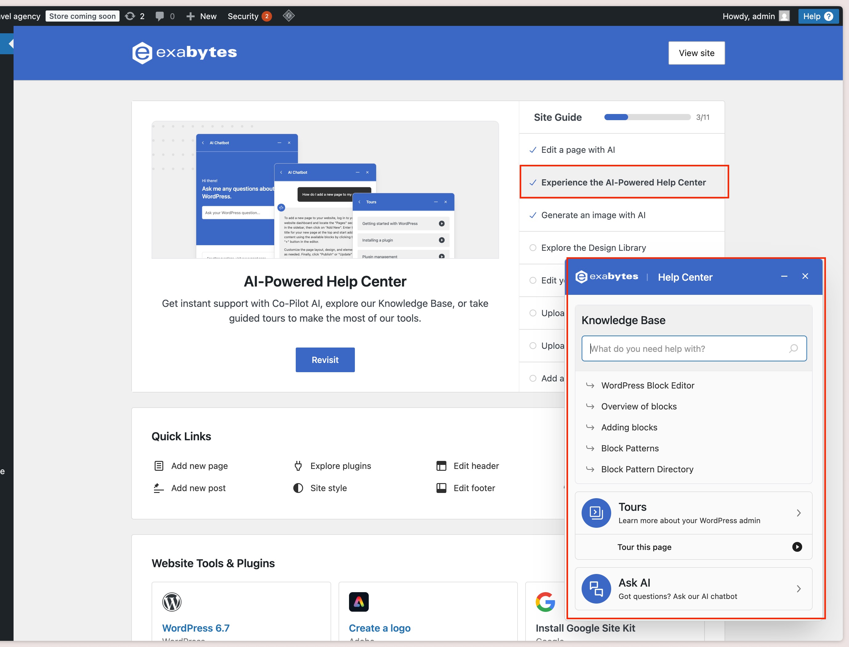 - Tours - An interactive guided tour of the WordPress admin and its functionalities