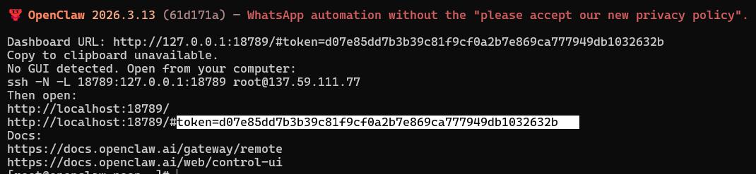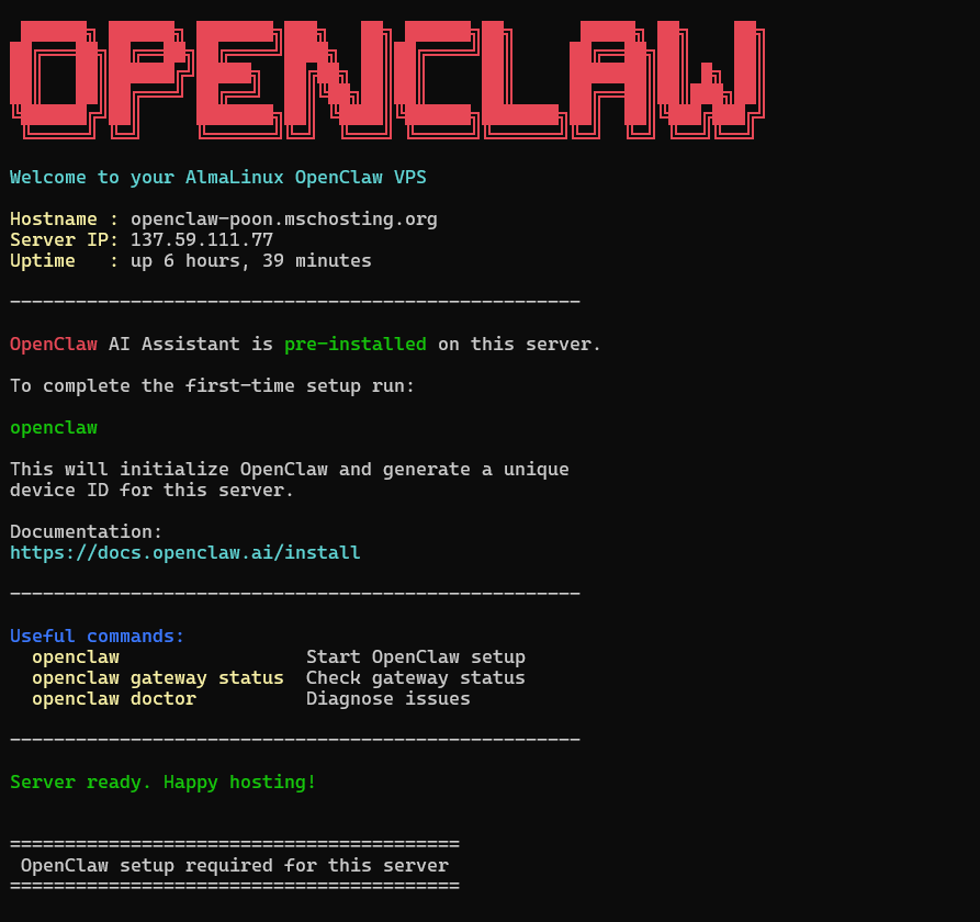 SSH into the server, and you will be met with the OpenClaw MOTD and Welcome Message.