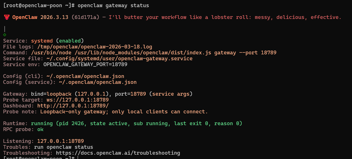 openclaw gateway statusto check on the OpenClaw Gateway Service.